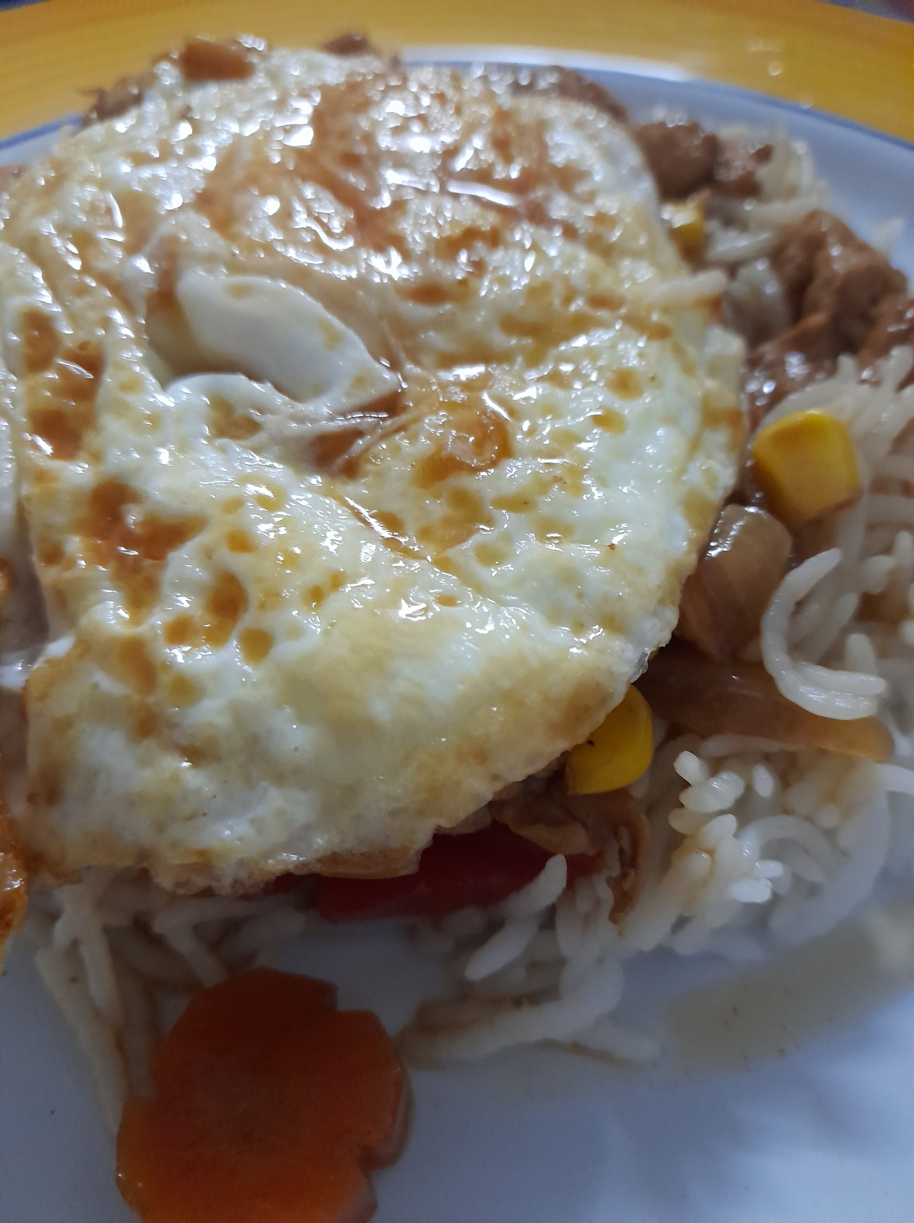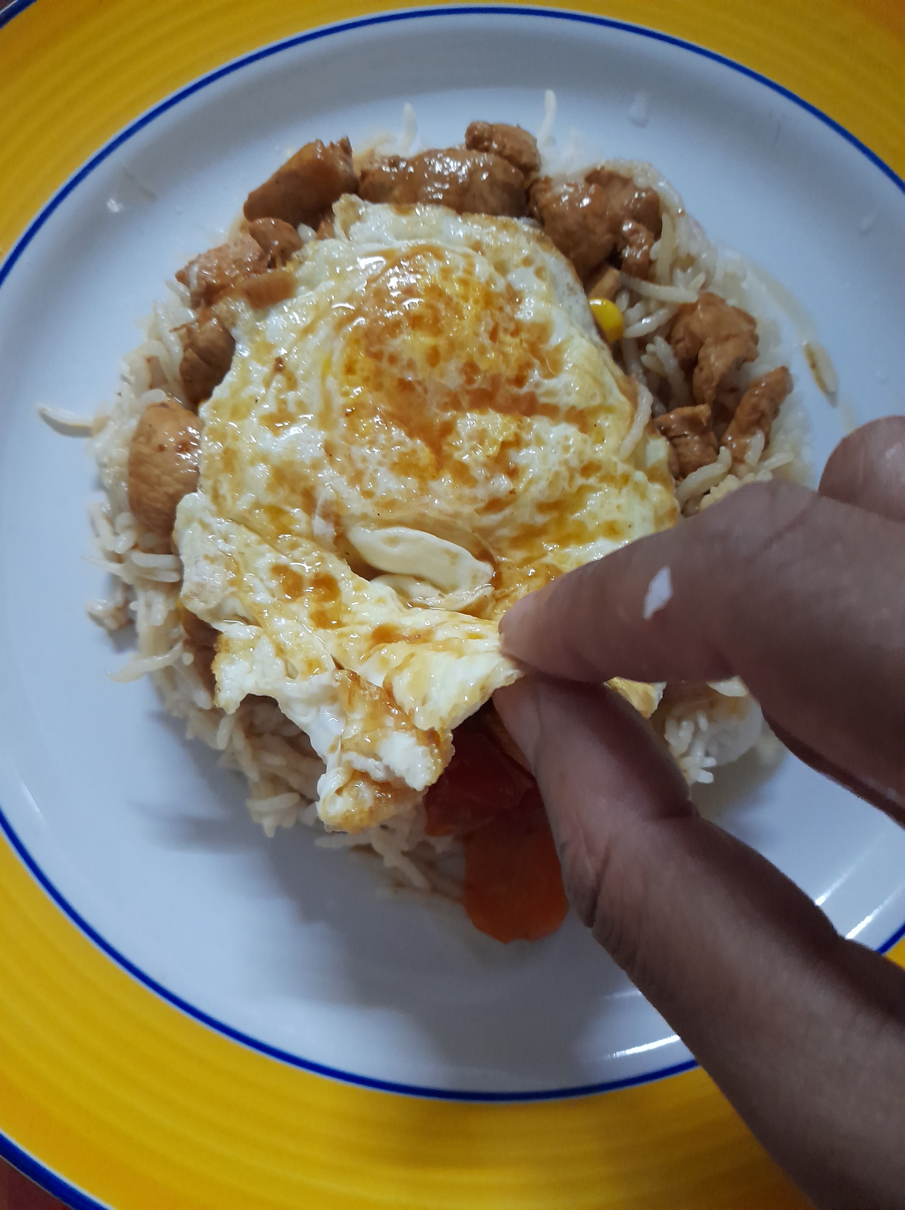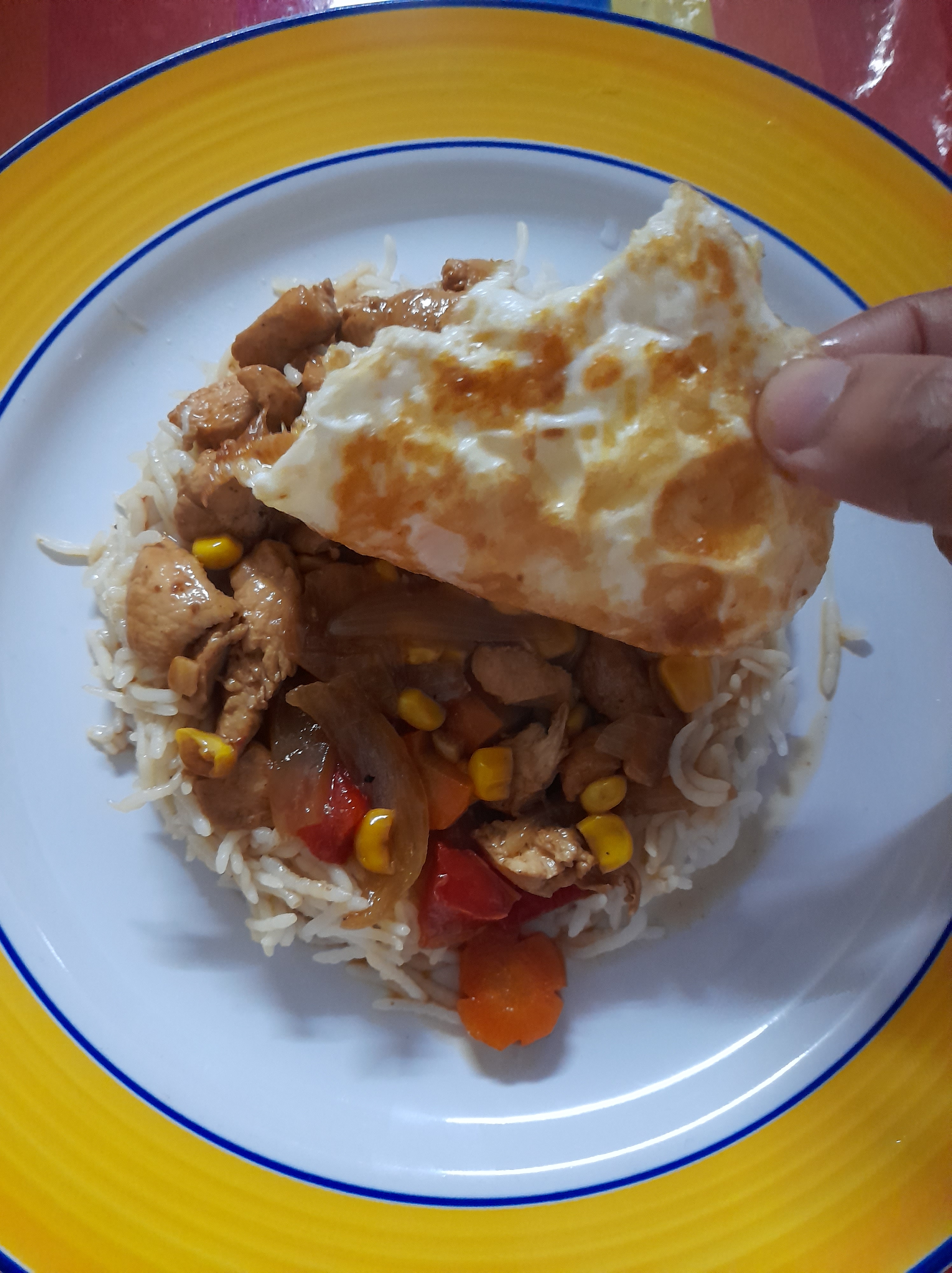 - In a bowl, add the fried egg at the bottom. Put some rice over the egg. Then add the sauce with the chicken and veggies.