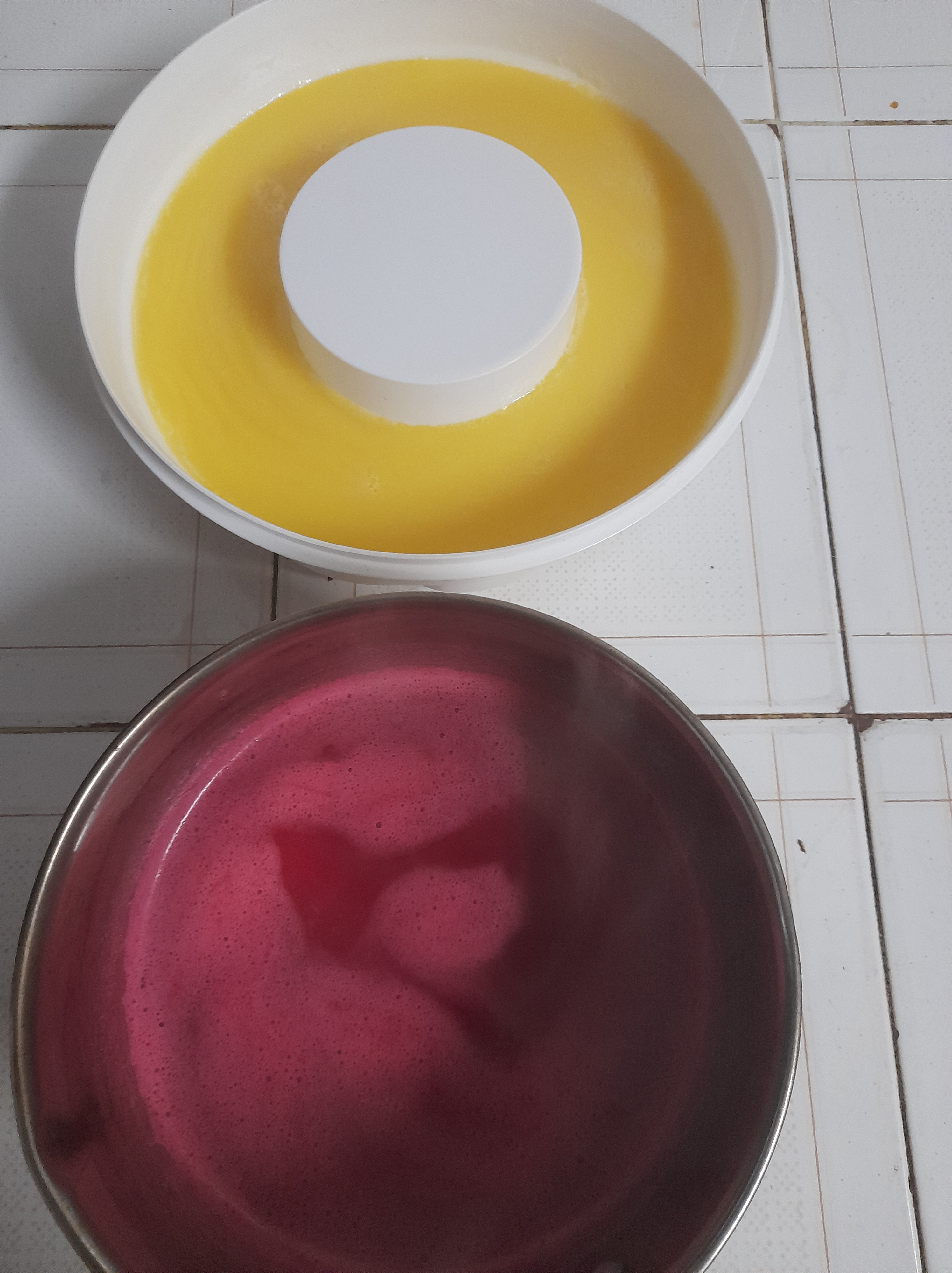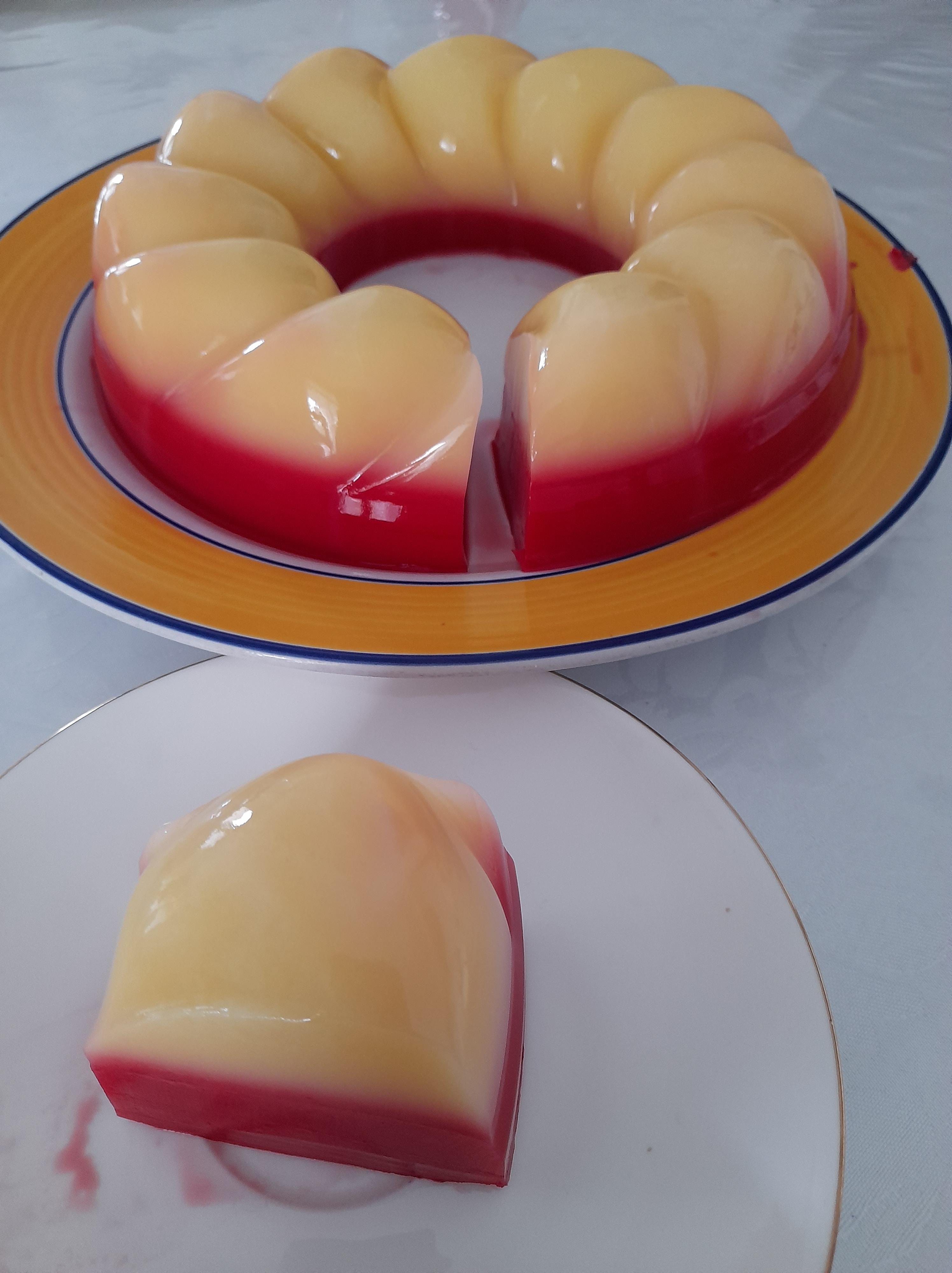 - Once the vanilla agar agar has set in the mold, pour the strawberry hot liquid over the already set vanilla agar agar. Allow the strawberry mousse to set at room temperature for one hour.