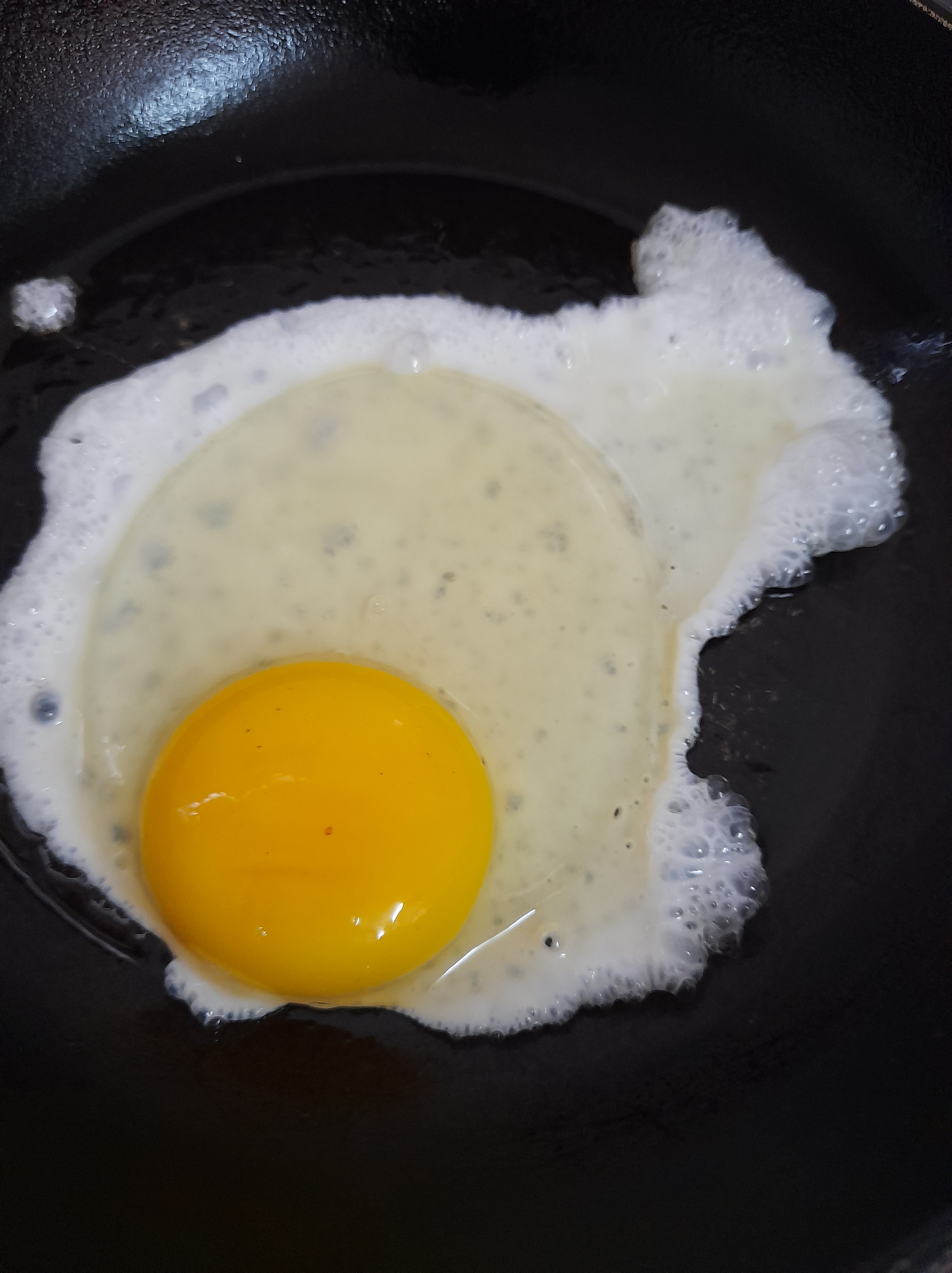- In a pan, add some oil. Heat the oil. Fry an egg and sprinkle salt over the top. Cook on both sides for a few minutes.