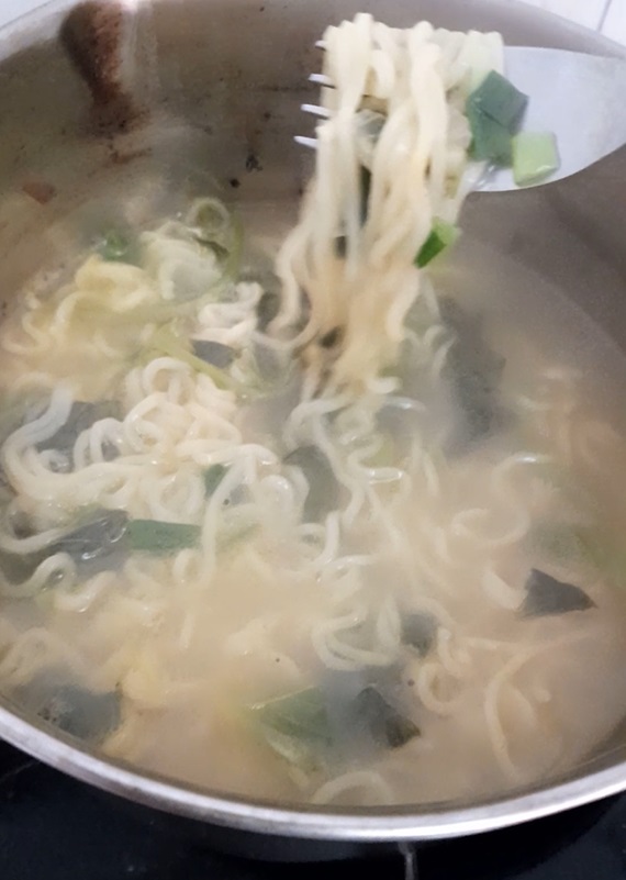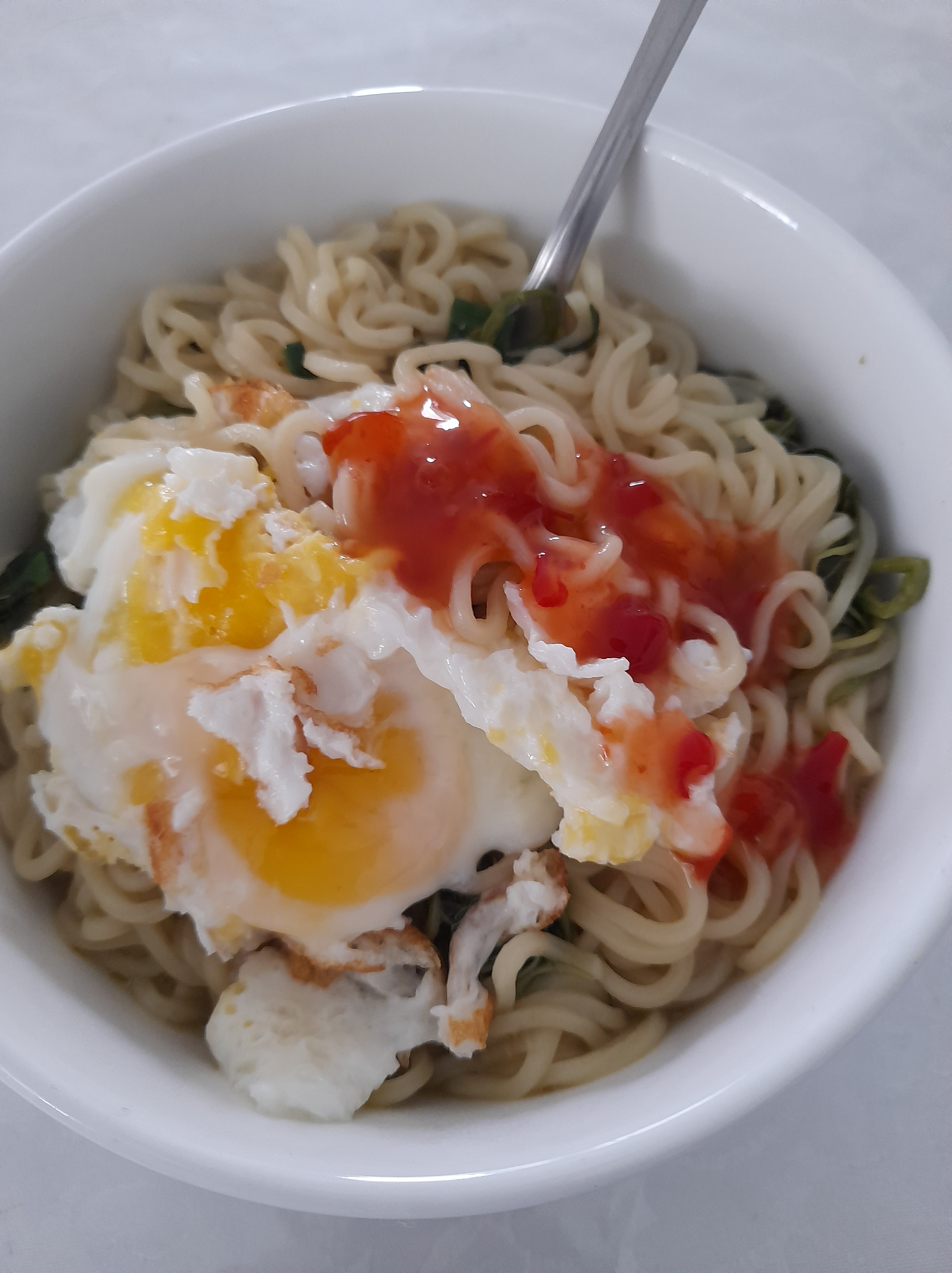 - Pour soup and noodles in a bowl. Add the fried egg on top.
