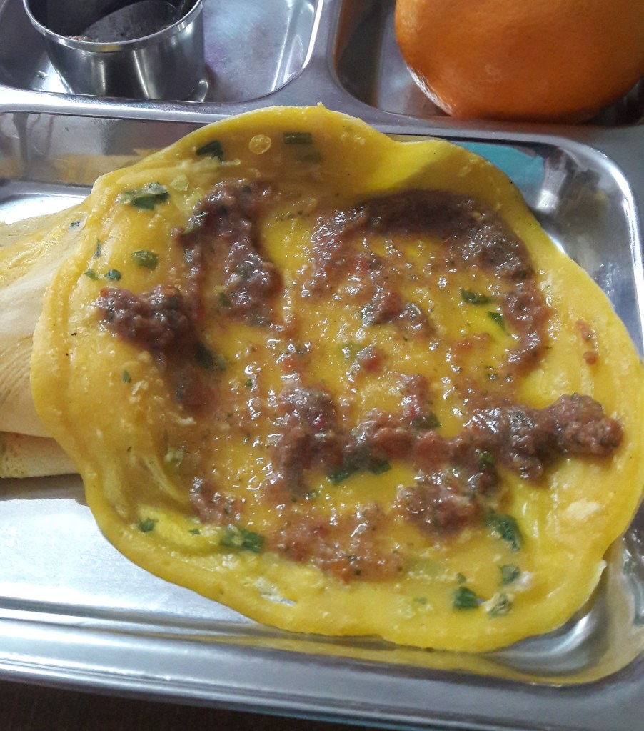 1.In a bowl, add 200g sieve white flour, 1 tablespoon corn flour, a pinch of yellow coloured powder, 2-3 tablespoon spring onions,salt. Beat an egg and add to the mixture.