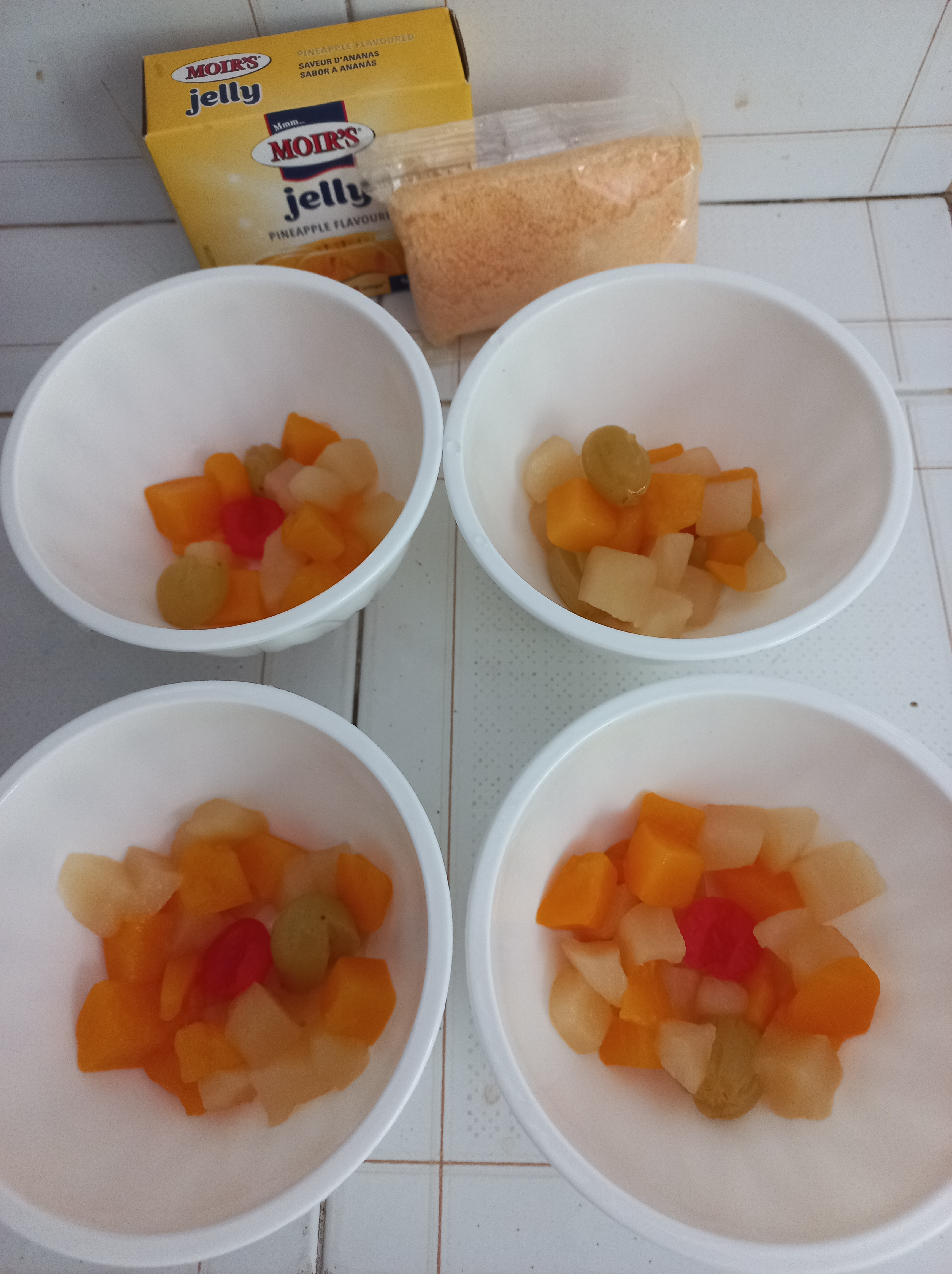 - Open a canned fruit mix. Remove the syrup by straining and reserve the fruits in these small bowls.