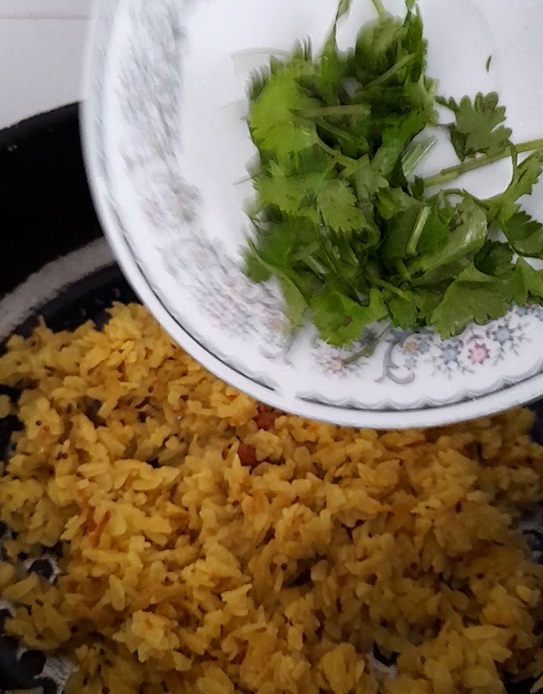 - Squeeze a bit of lemon juice over the poha. Sprinkle coriander leaves over the poha!