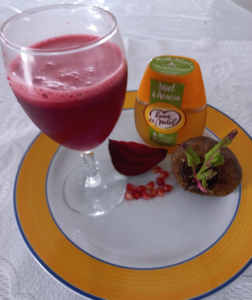 6. In a blender, add all the pomegrenade fruits/seeds, add the beetroot slices, add 200 ml water, 2 tablespoon honey. Blend the mixture. Then strain the juice so as to remove residual seeds. Add 2 cubes of ice. Serve chill in glass.