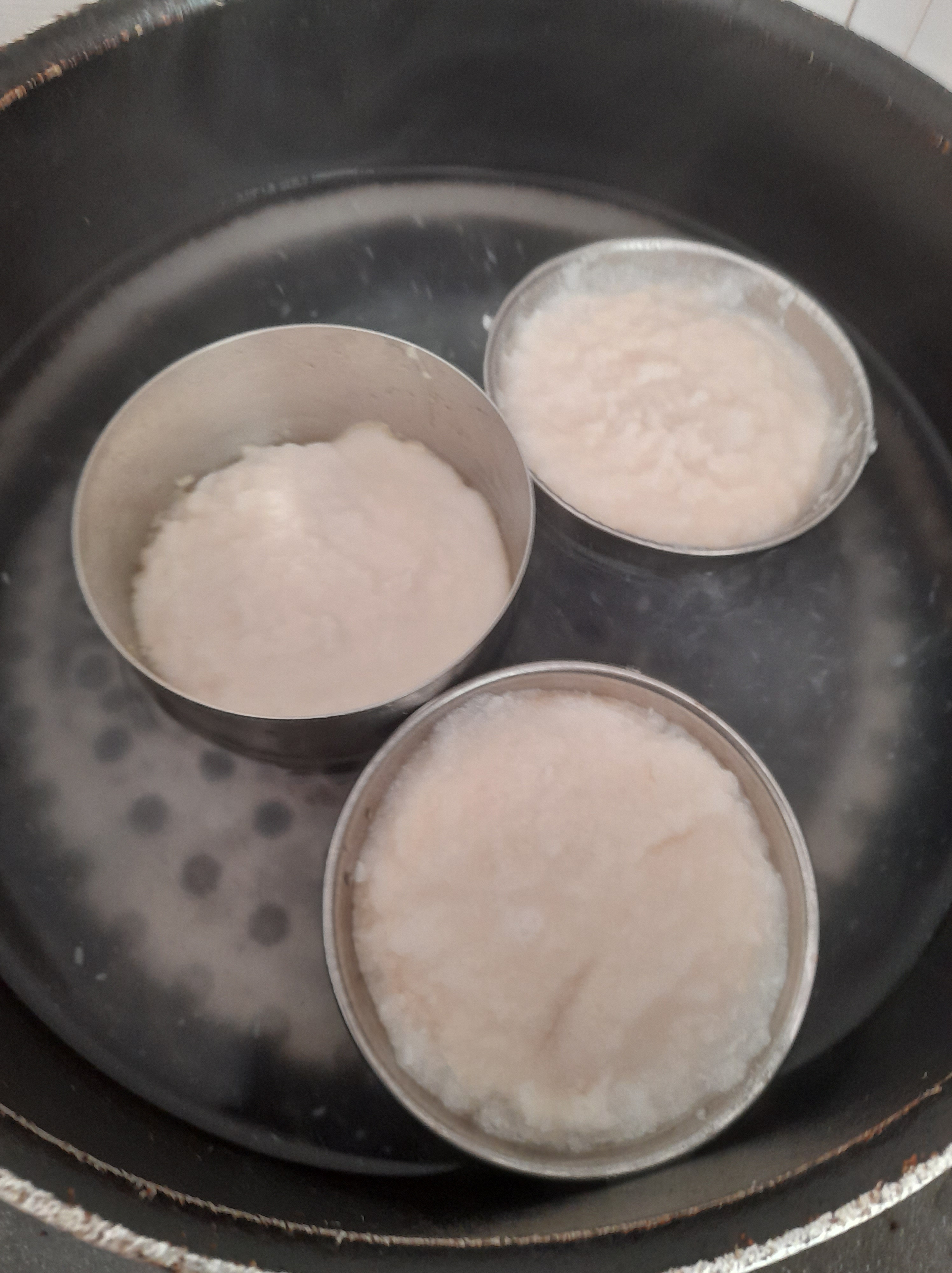 12. Add water in a large pan as shown in picture. Place those small rounded bowls over the water.