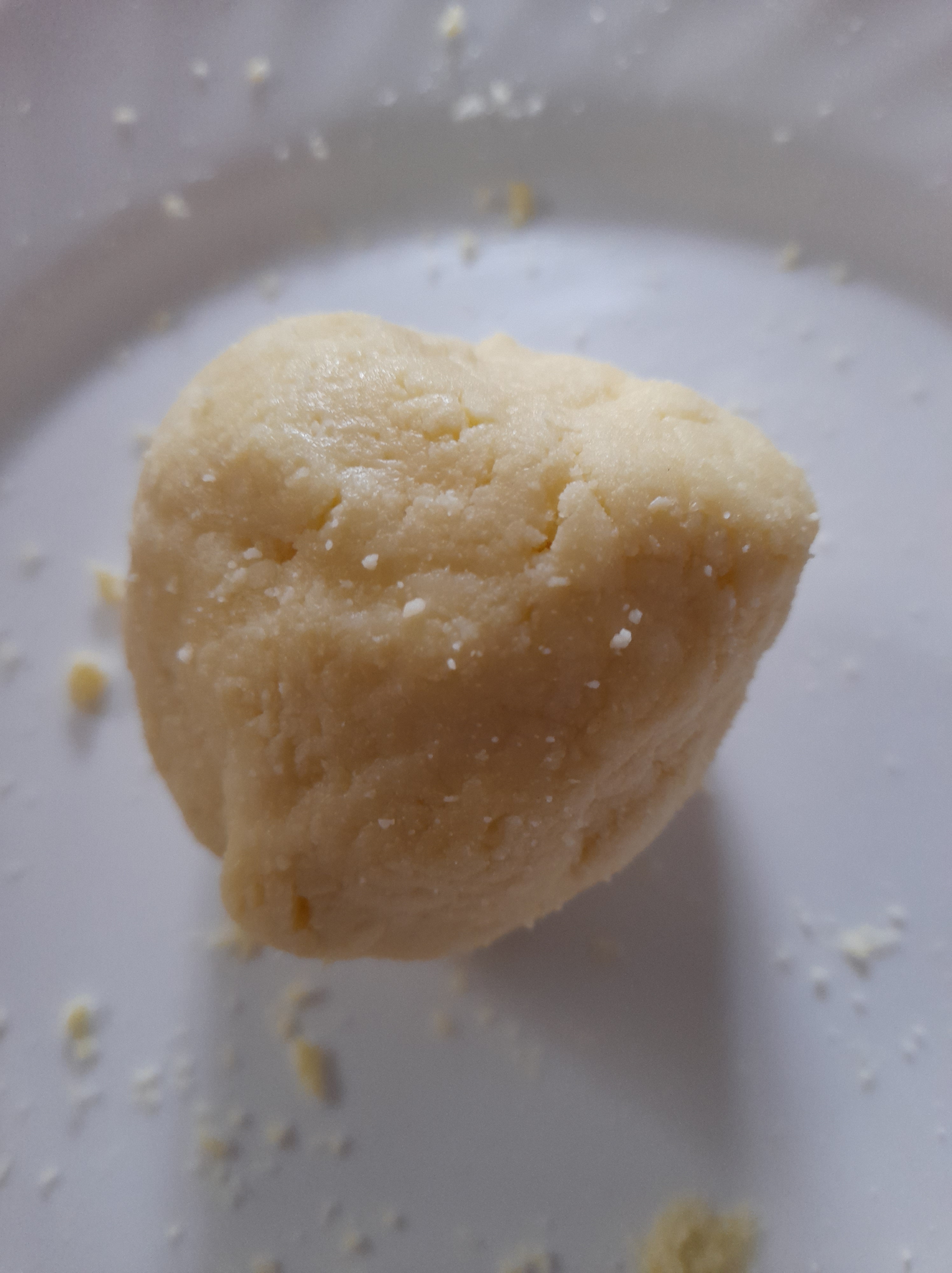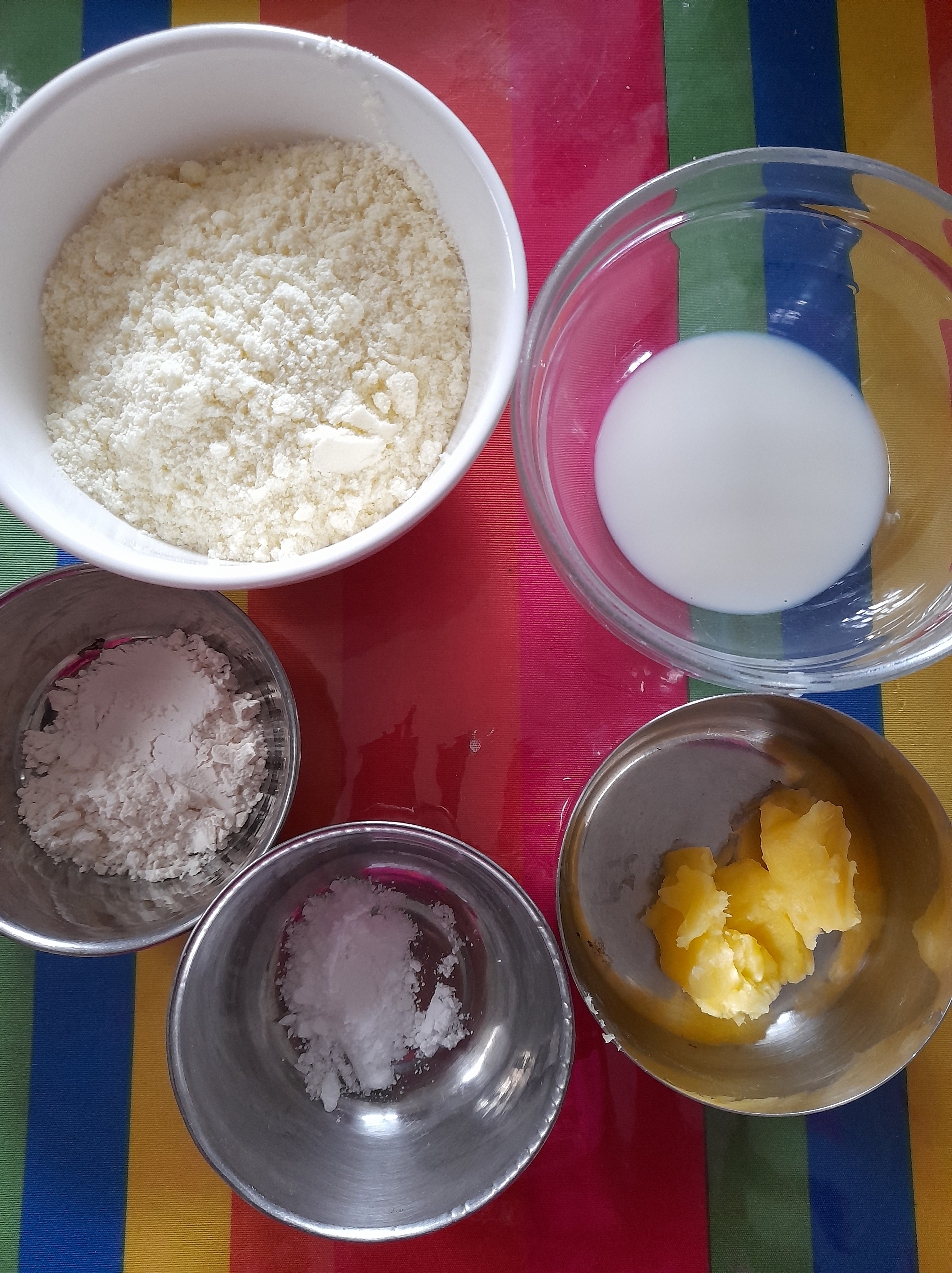 - In a bowl, add 100g milk powder, 2 teaspoon of white flour, 1 teaspoon of baking powder and 2 tablespoon of QBB ghee. Mix thoroughly till a grainy texture. Now add few tablespoon of liquid milk that will allow to knead and make a dough. Don’t knead too much otherwise the dough will become hard. The dough should neither be hard nor be too soft. Allow the dough to rest for some 10 minutes. Then make small balls and flatten each of them.