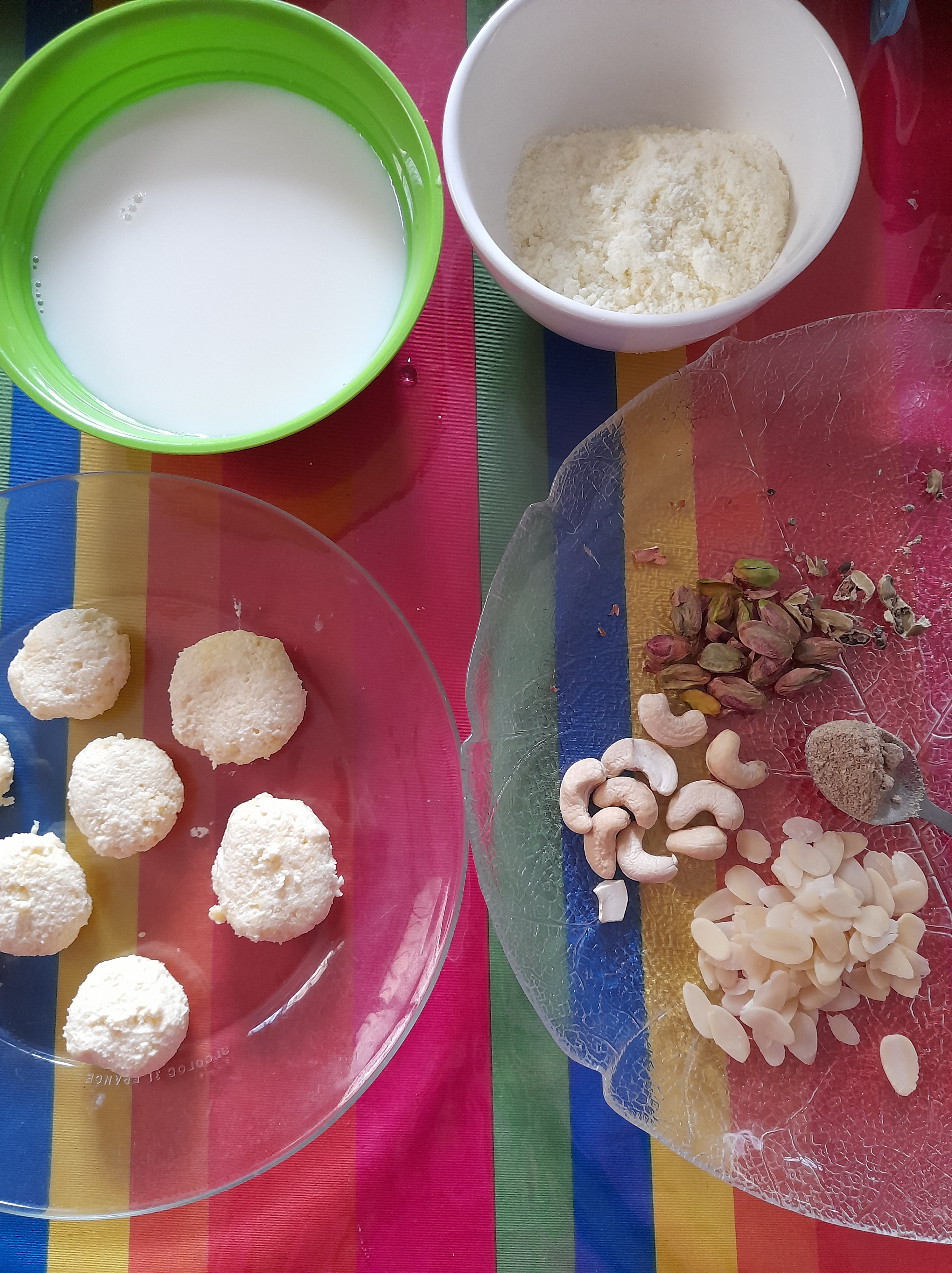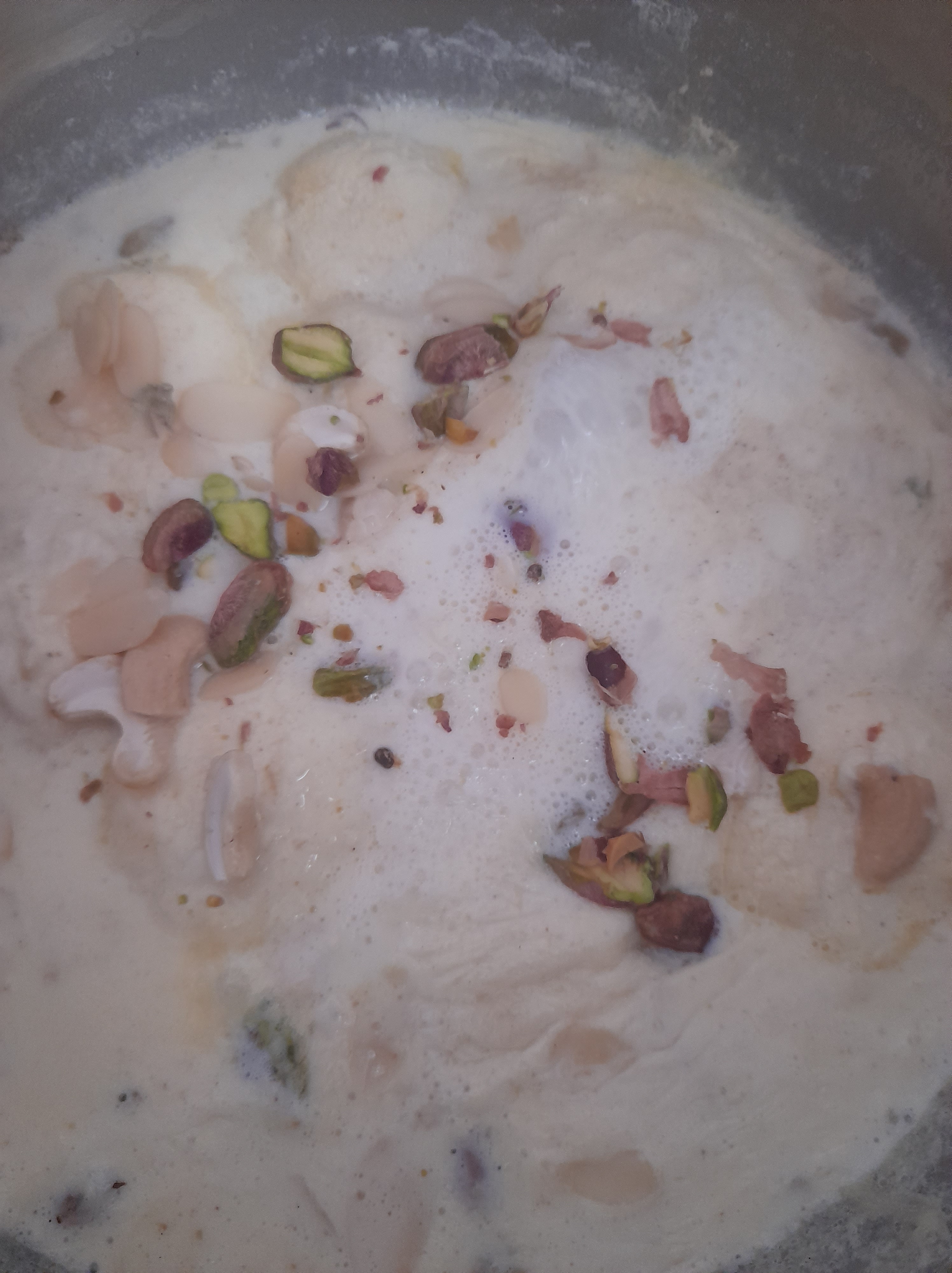 - Transfer the ras malai in a glass vessel. Allow to cool.