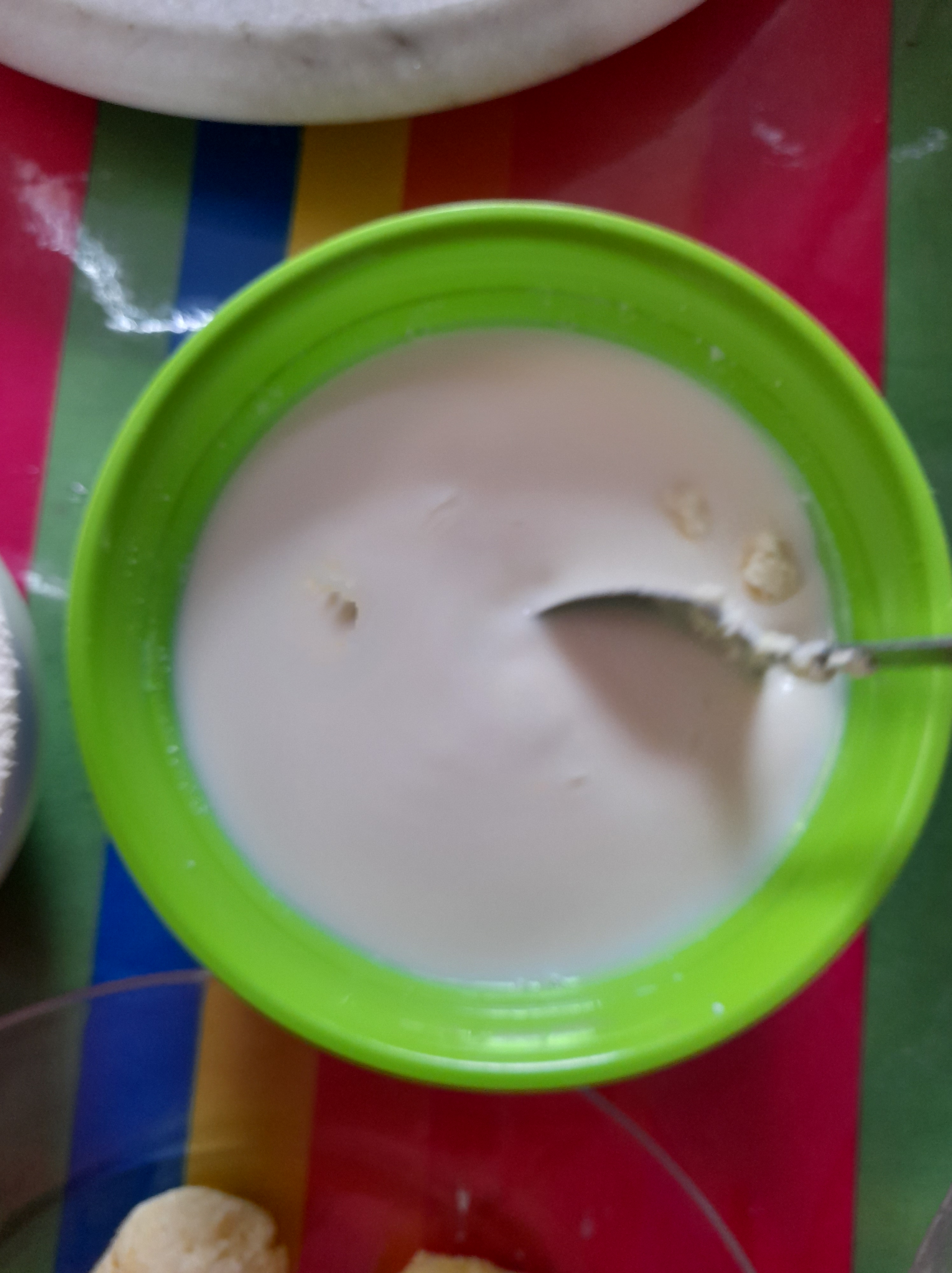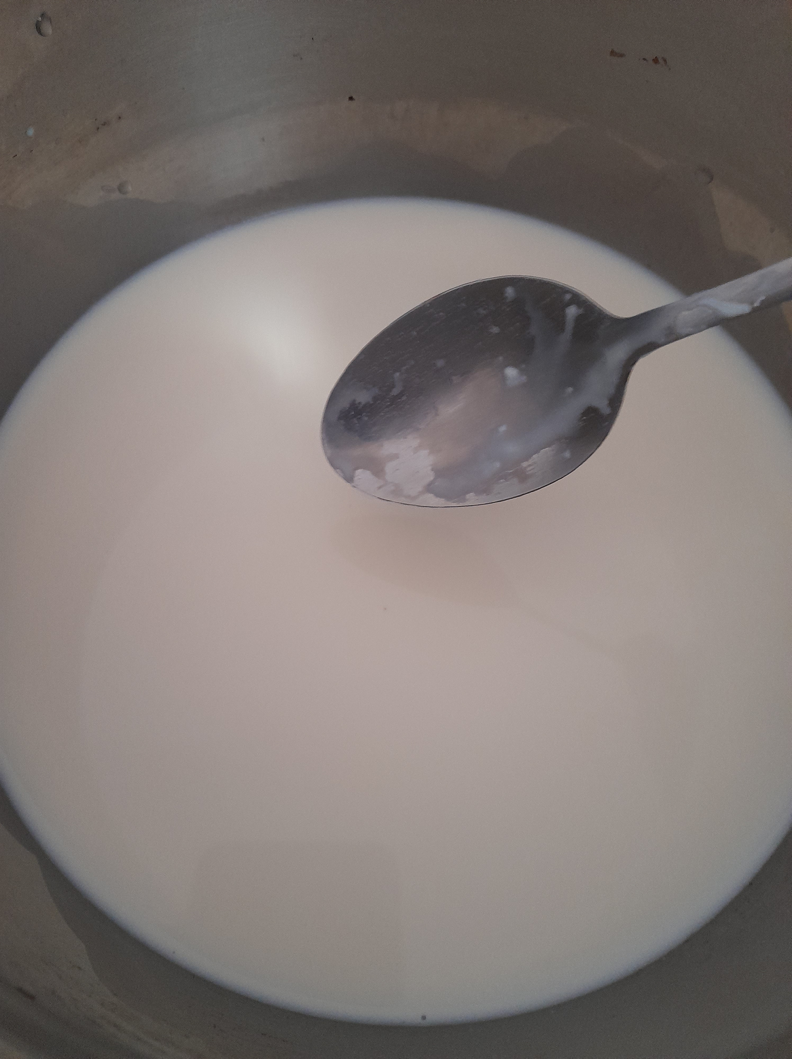 - In another bowl, add 2 cups of liquid milk and 3/4 cup of milk powder. Mix thoroughly till there is no lump. Pour the milk in a pan and put to boil on low heat.