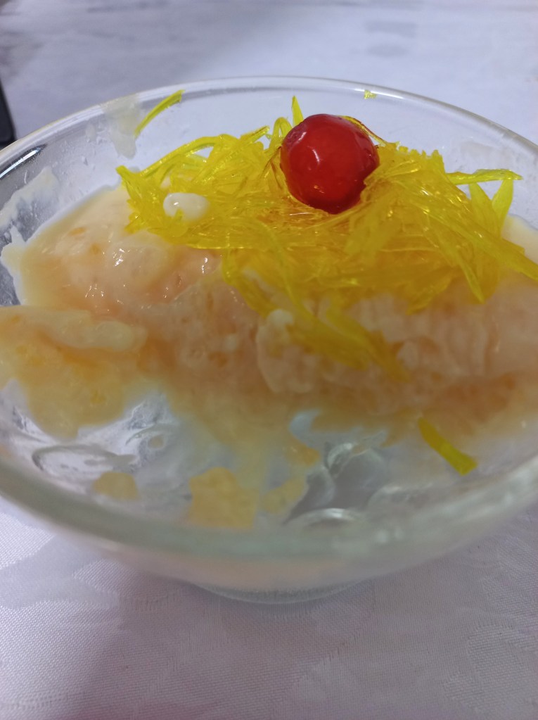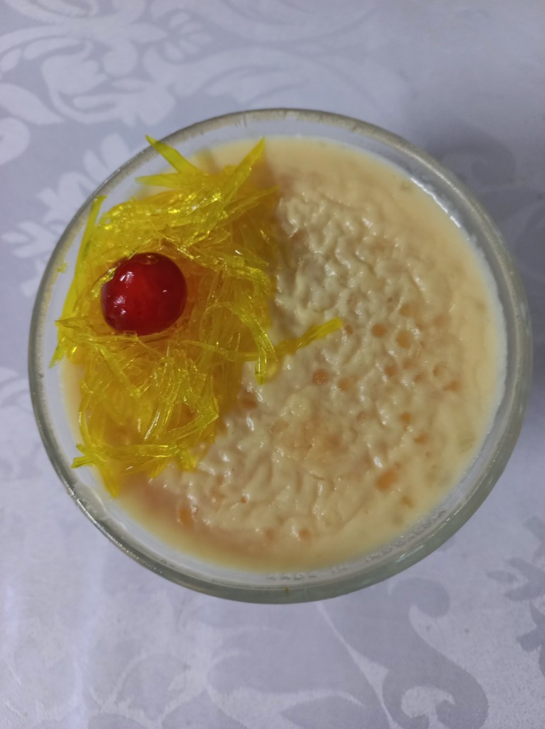 12.When the tapioca pearls and custard have set, sprinkle the yellow grated agar agar on top of the dessert and add a cheery on top. Serve chill.