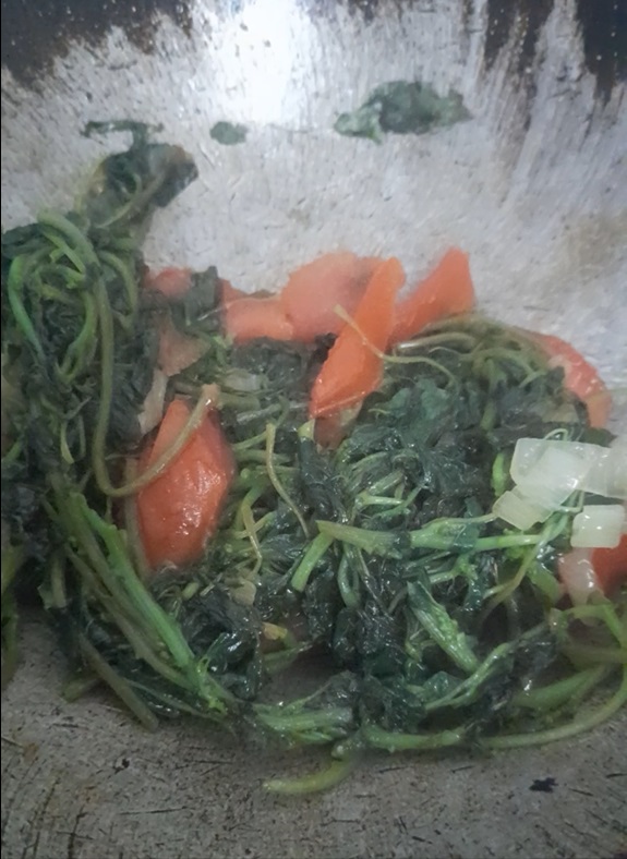 - No need to put water for cooking. As the leaves decrease in size, add tomatoes on top and cook again by closing the lid.