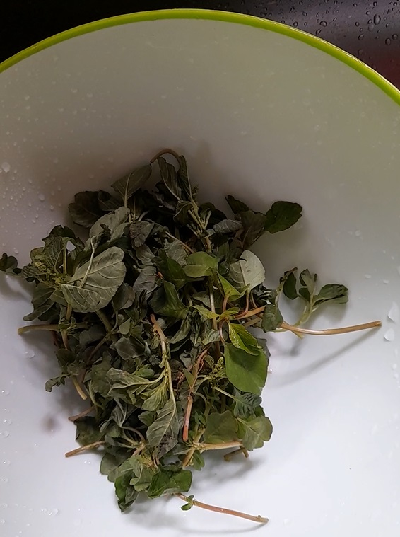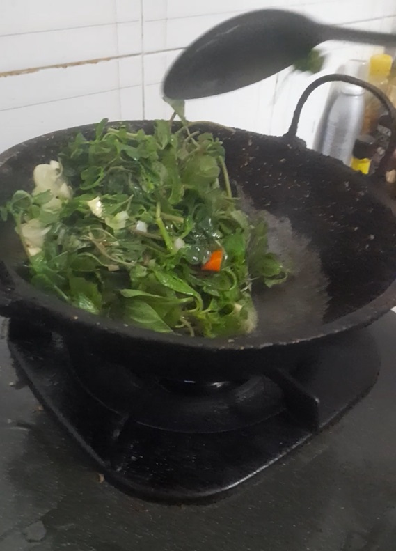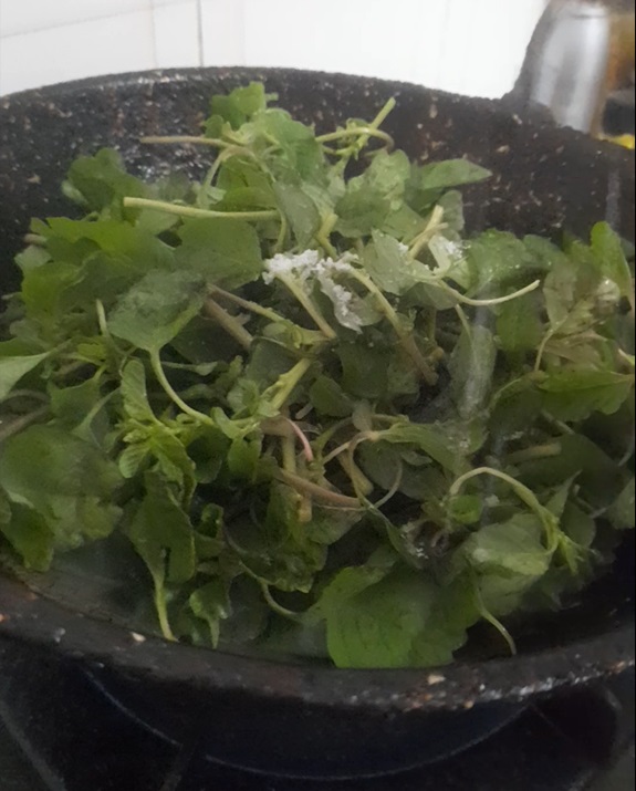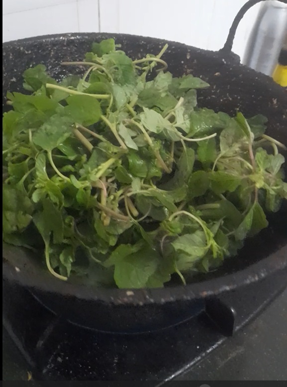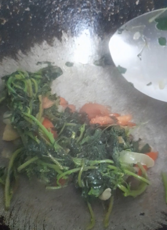 - Add all the amaranth leaves and cover with a lid. Allow to cook.