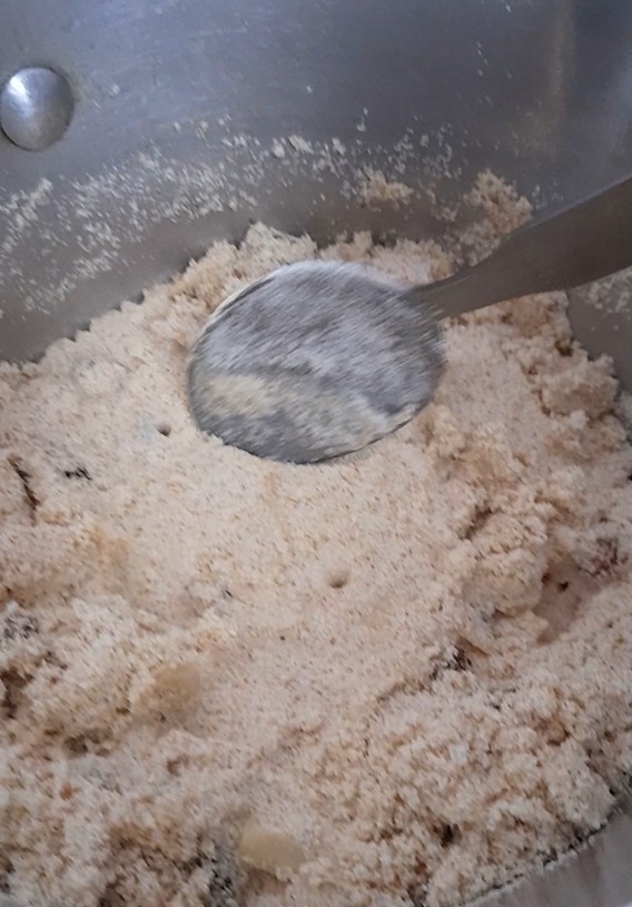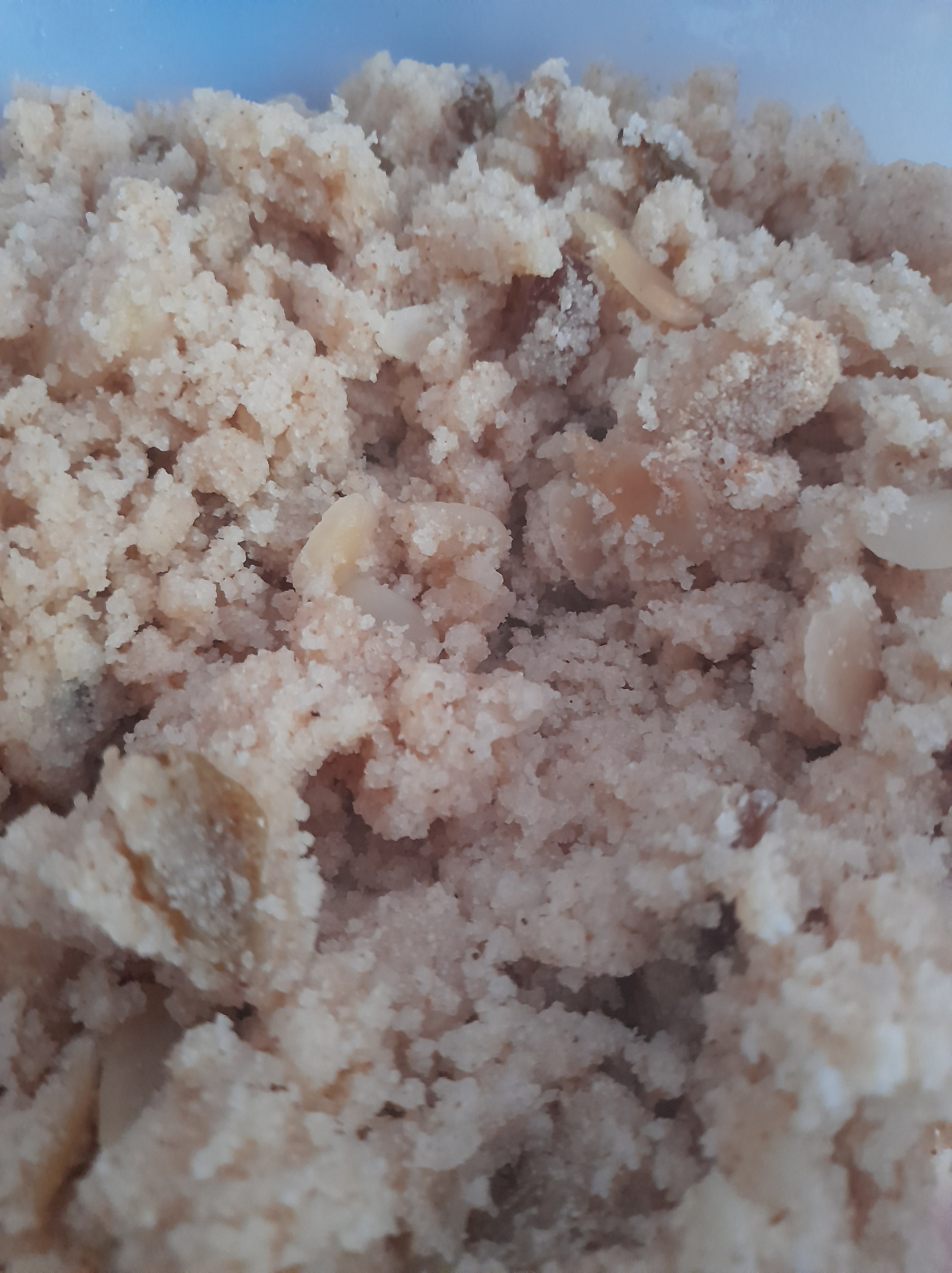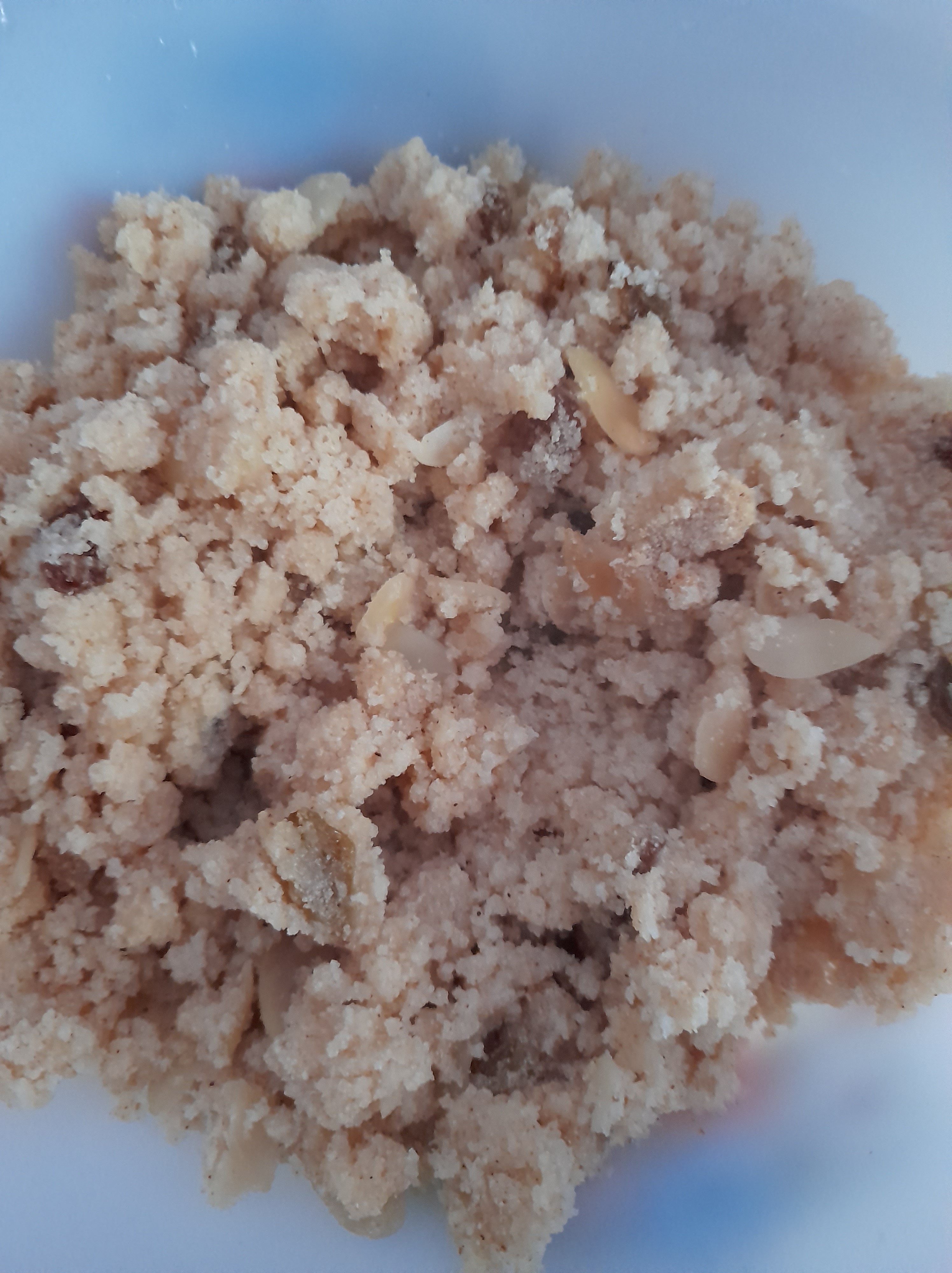 1.Put to boil raisins and almond. Remove. Peel off almond and crush them into smaller pieces.