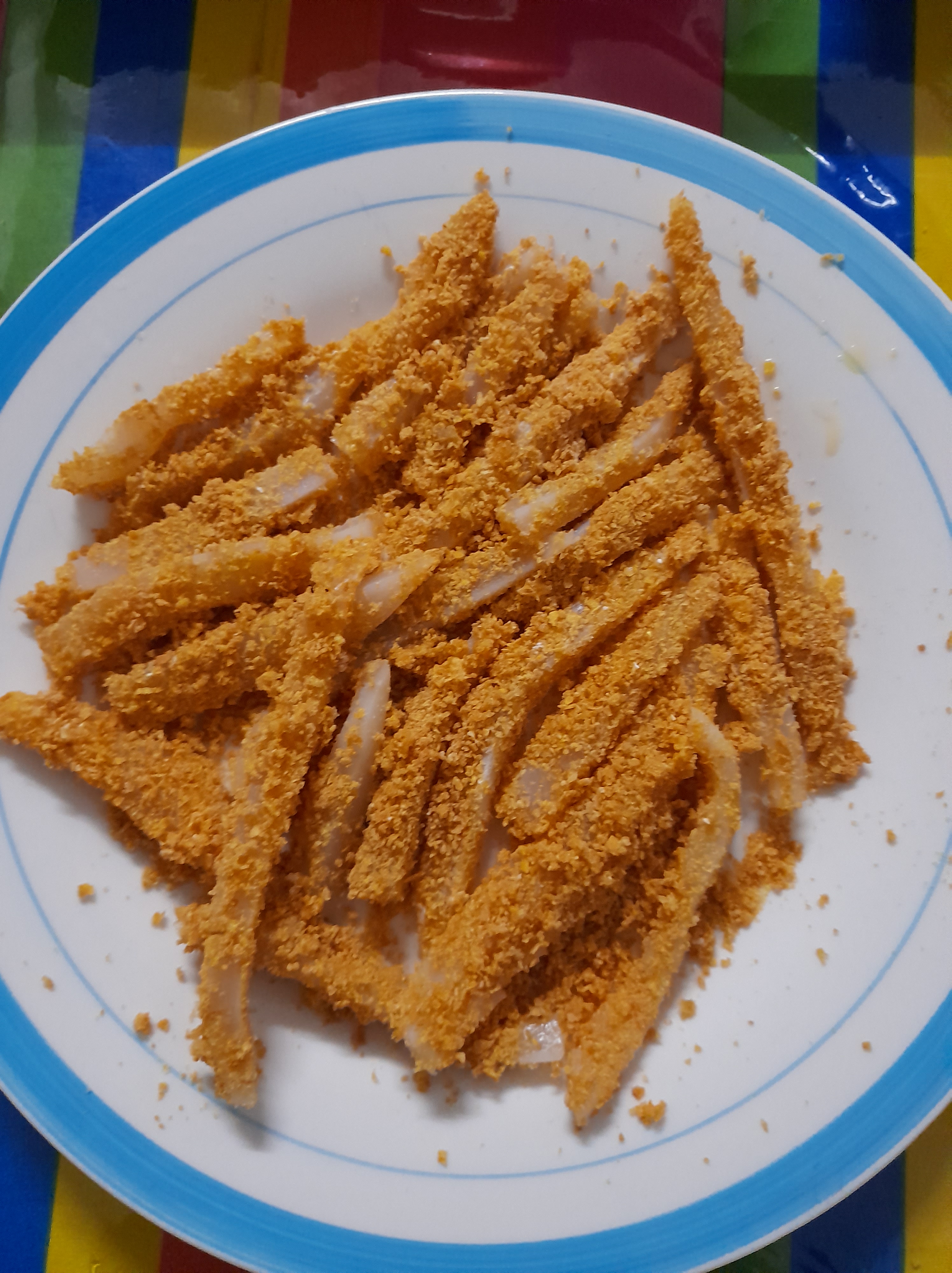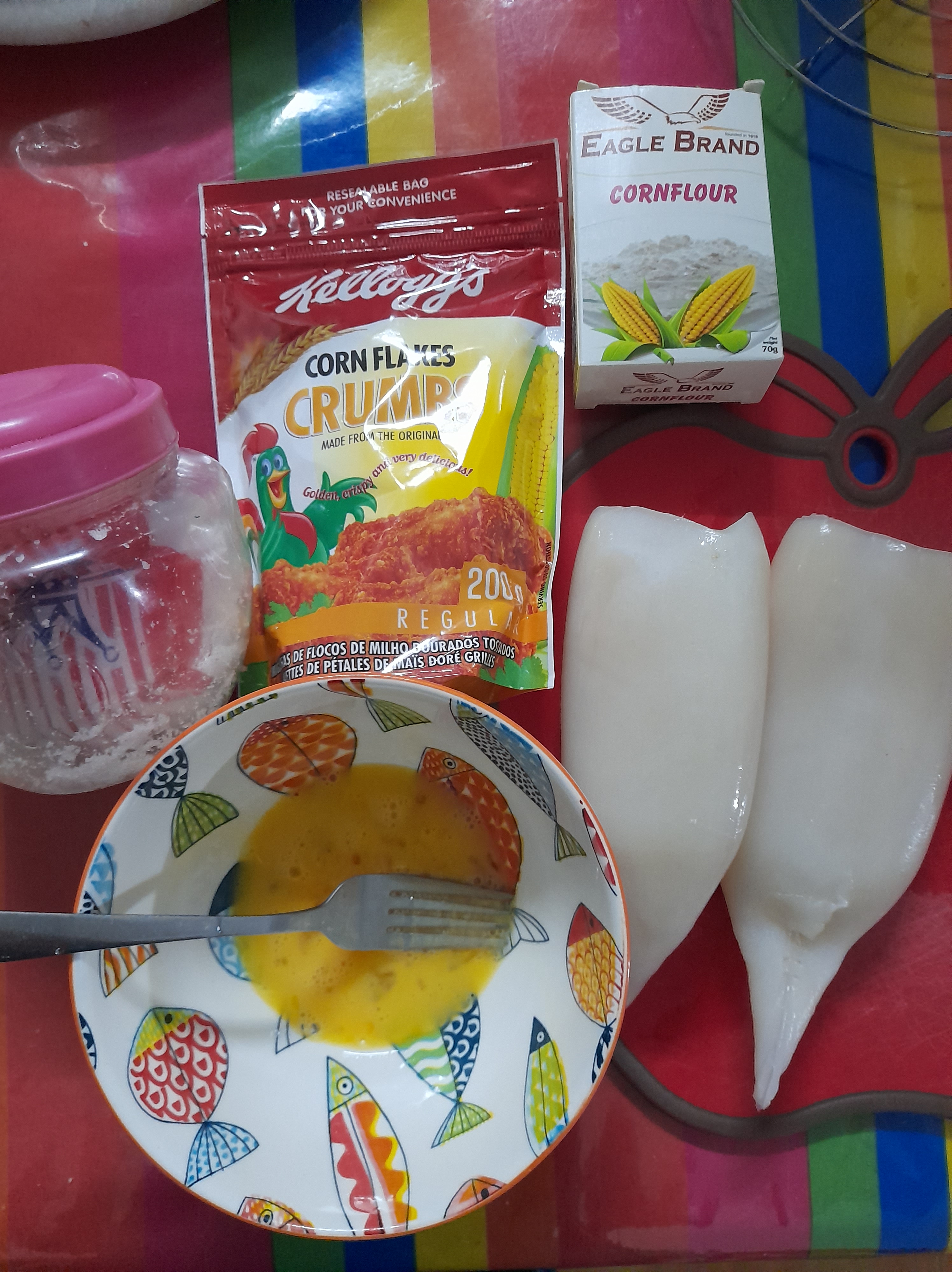 - Roll the squid strip in beaten egg, mix a bit of salt and roll in cornflakes crumbs.