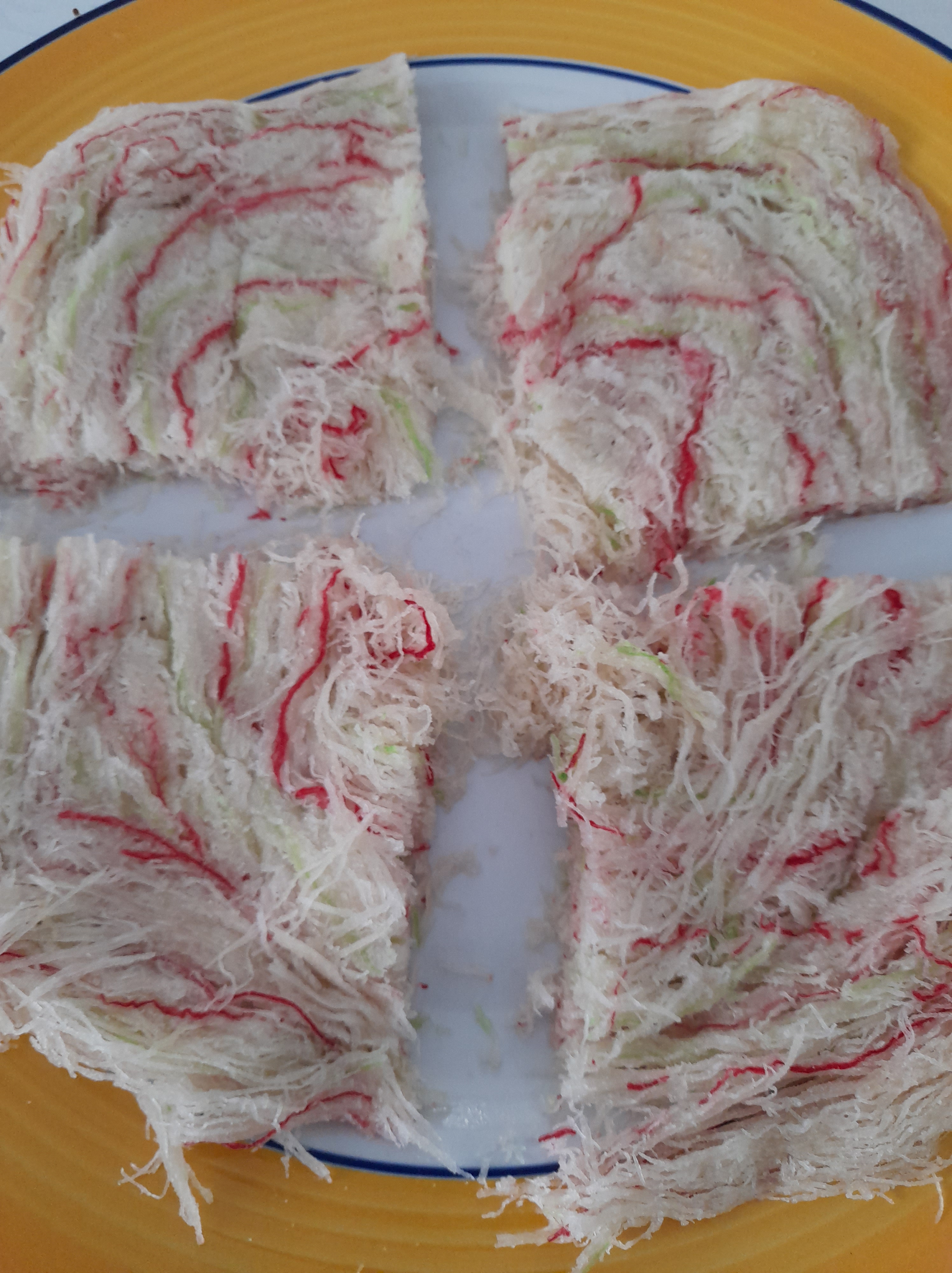 Sutarfeni is a Gujrati and Rajasthani sweet that is made from Phyllo pastry/kataifi pastry, melted ghee, white sugar syrup, red/green food colouring, cardamon powder.