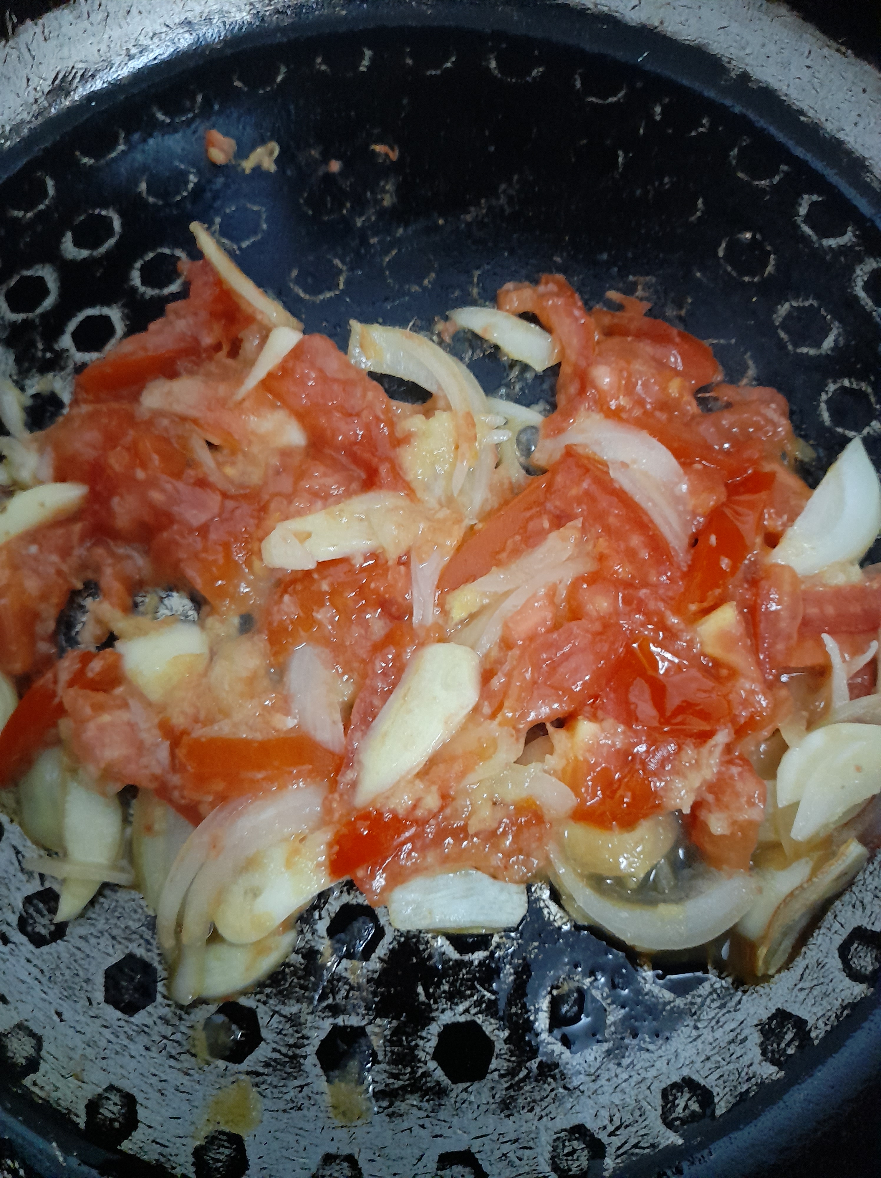 5. Sautee 1 tablespoon of ginger/garlic, 1 onion slices and 2 small tomatoes till tender.