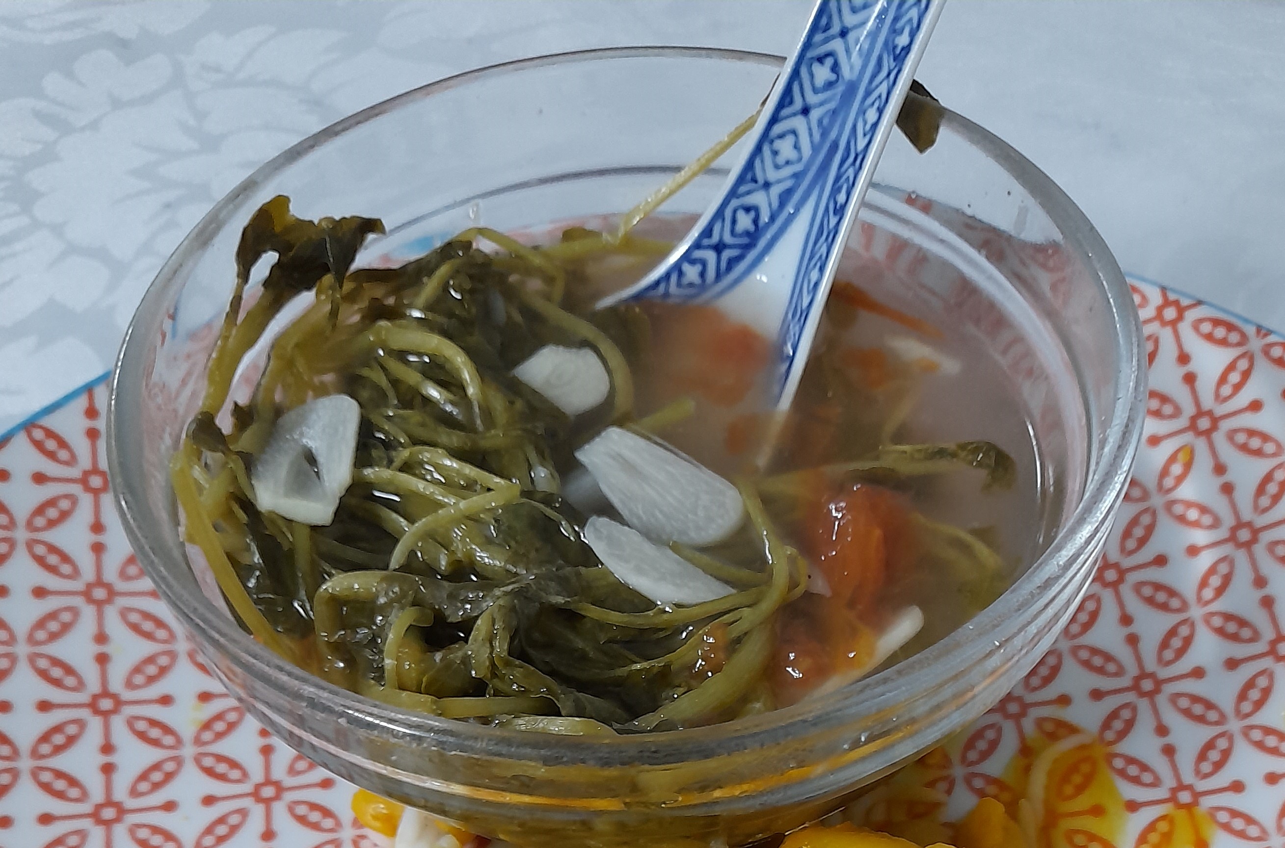 2.For the watercress, cut half part of it and conserve only the leaves and half of the watercress upper part. Wash thoroughly. Place the watercress in a pan of water with salt and vinegar to remove any impurities for one hour.