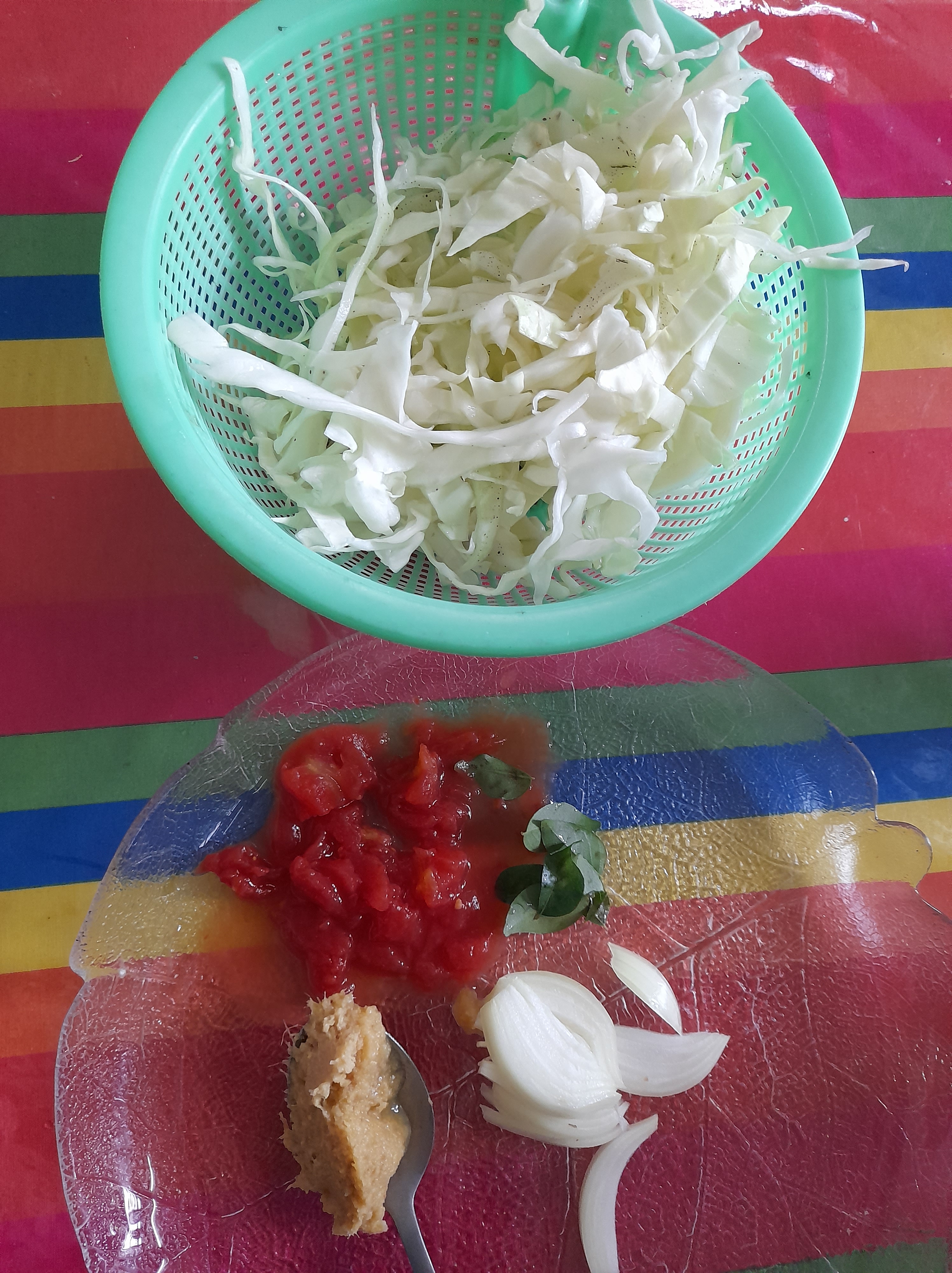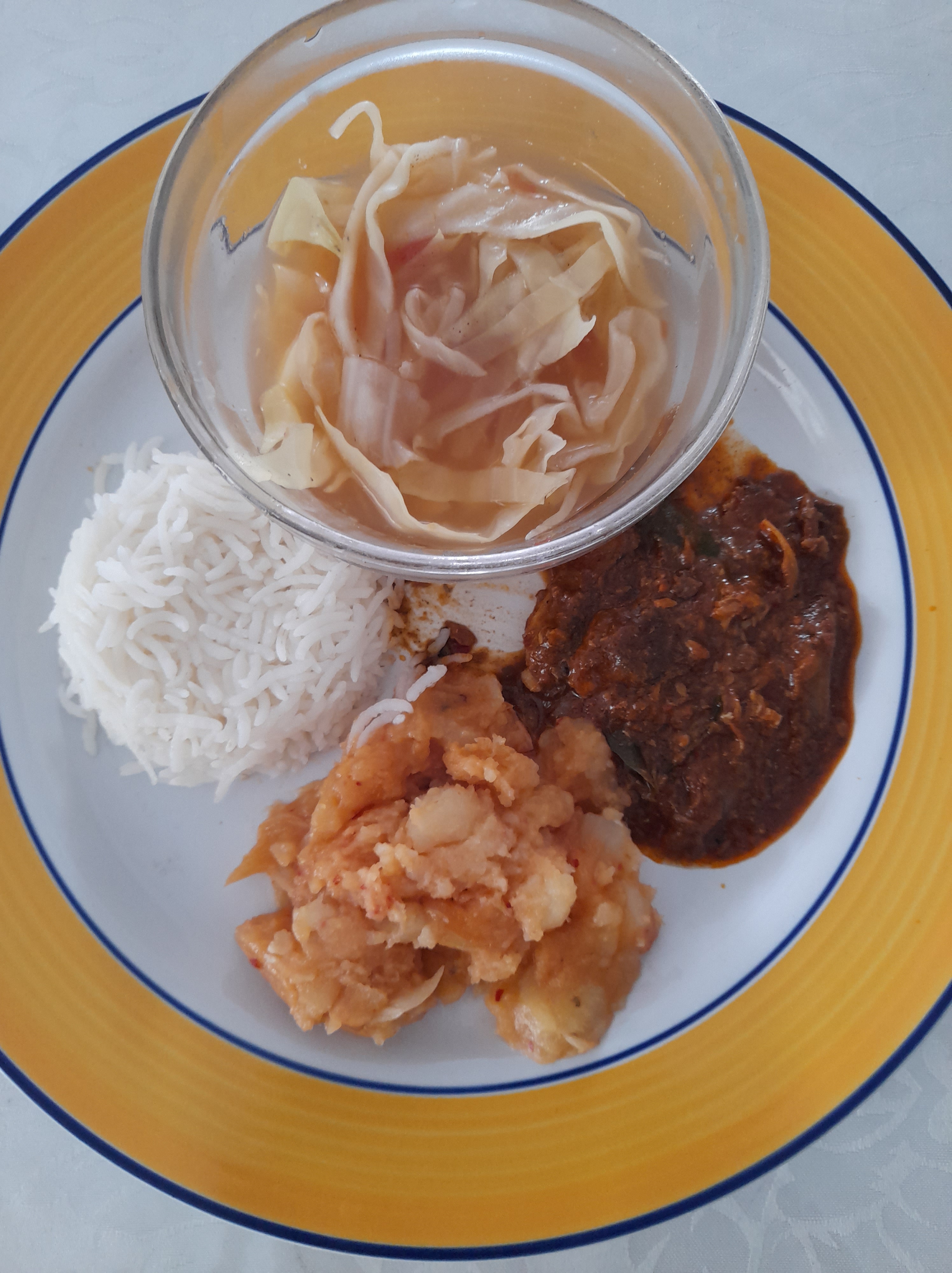 Serve hot white cabbage soup with rice, potato chutney and pilchards !!
