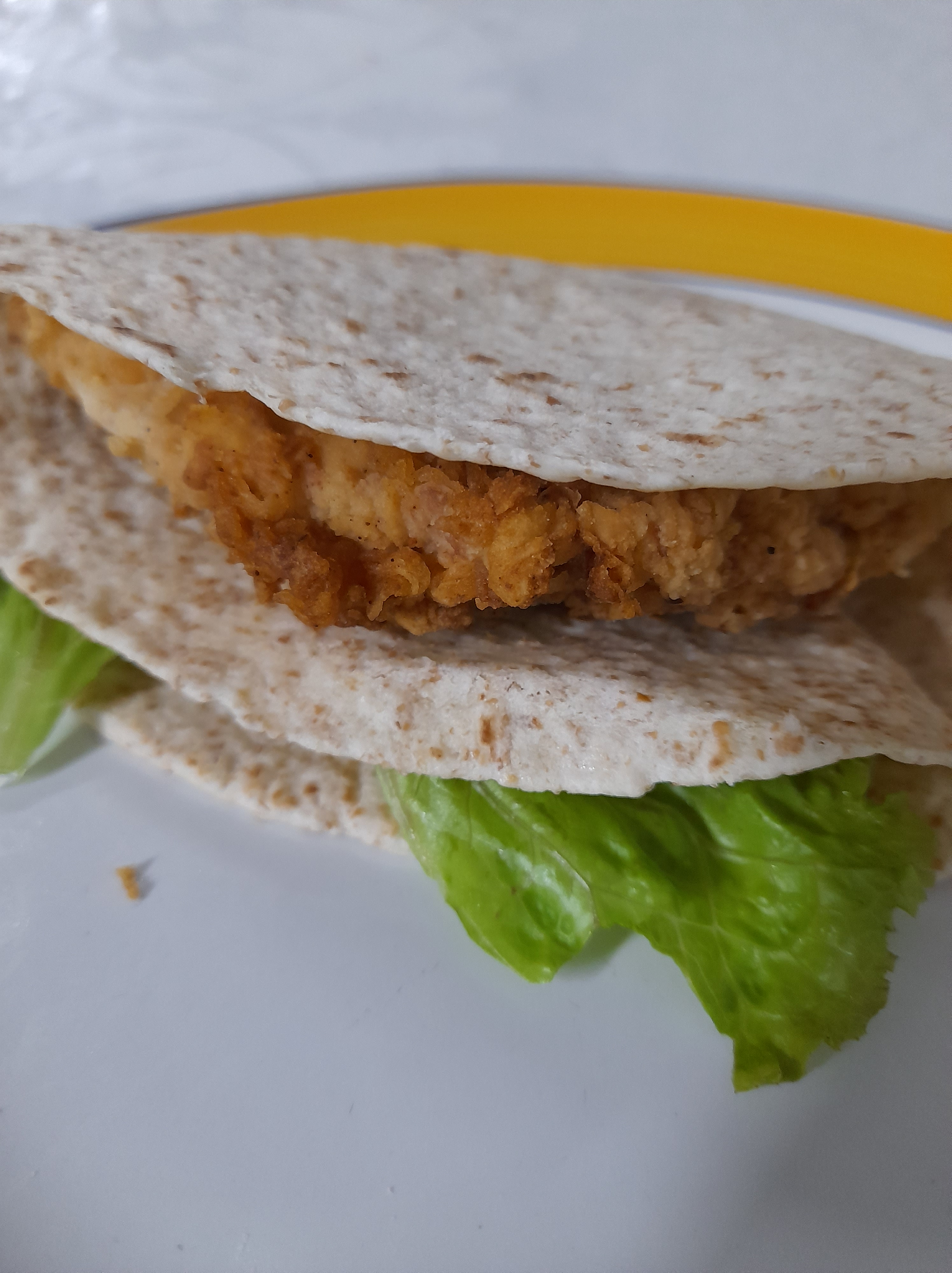 7. Then, take the cheese lettuce wrap part and close it over the chicken part moving right upper direction.